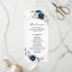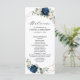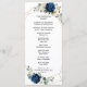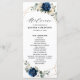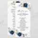 Cartão azul-escuro do programa de casamento floral, com buquê elegante de azul-marinho, azul-real, branco, ouro, marfim de champanhe, rosa de cor escamosa, hydrangea, ranunculus, pénia, botões de flores e folhas verdes de eucalipto sábio e uma elegante cor de água com uma imagem neutra geométrica arredondada. Entre em contato comigo para obter ajuda sobre a personalização ou se você precisar de outro produto com este design.