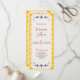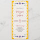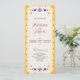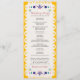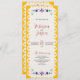Este design do Programa de Casamento Boda do Papel Picado Amarelo Mexicano apresenta um layout vertical alto com um centro branco macio e texturizado por uma borda enrolada decorativa que se assemelha a recortes de papel complexos. O fundo é um ouro amarelo arrojado, aumentando o contraste e a vibração da borda. Tanto as bordas superior como inferior apresentam motivos simétricos de arte folclórica com flores roxas, folhas verdes, sotaques magenta e florescimentos ornamentais coloridos, dando-lhe uma sensação festiva e artesanal.