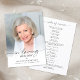 Invite family and friends to honor and celebrate the life of your loved one with this minimal yet elegant funeral, memorial service or Celebration of Life event program card. This modern design showcases a cherished full-bleed photo on the front, the sentiment IN LOVING MEMORY in elegant script typography with their name and dates in black and white. The back side includes the order of service, poems or readings, song lyrics and personal message to guests or an obituary, creating a thoughtful keepsake. Easy to personalize with your picture and text and your choice of text and graphics colors, this program is a beautiful way to celebrate a life well lived. ASSISTANCE: For help with design modification or if you would like coordinating items, contact the designer BEFORE ORDERING via the Zazzle Chat MESSAGE tab or email makeitaboutyoustore@gmail.com.