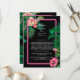 Uma moderna, mas retrorada, botânica tropical rosa-néon em fundo negro. Um belo design de casamento ideal para o verão. Design de plantas tropicais, cor-de-rosa, néon perfeito, com palmeiras, flores de Hibiscus cor-de-rosa e flores de Plumerias Frangipanis. As cores pretas, cor-de-rosa e verde dominam este design de neon rosa tropical. A tipografia da caligrafia moderna contrasta perfeitamente com o tema design do casamento preto e rosa. Uma design de cartão do programa elegante de casamento com elementos simples modernos. Também estão disponíveis itens de papelaria de casamento e outros formatos de convite de casamento.