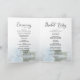 Torne fácil para seus convidados seguirem a cerimônia com esses lindos programas de casamento dobrados. A design apresenta um design maravilhoso e romântico com um solteiro longo e pálido, pálido e poeirento, de cor azul, deitado do lado, espelhado em uma piscina de água. Há uma escrita moderna nos títulos com espaço para detalhes sobre a cerimônia, a festa noiva, uma foto, uma nota de agradecimento e um breve memorial. Na parte da frente lê-se "Fazemos" com um coração romântico bonito entre as cartas. Elegante mas divertido, estes programas são uma maravilhosa adição à sua papelaria de casamento.