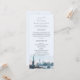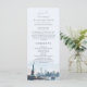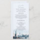 Elevem seu dia de casamento com nosso elegante Programa de Casamento Skyline de Nova Iorque Watercolor. Este design impressionante mostra uma ilustração caquicolar cativante da linha do horizonte Nova Iorque, incluindo a Estátua da Liberdade e o porto agitado.