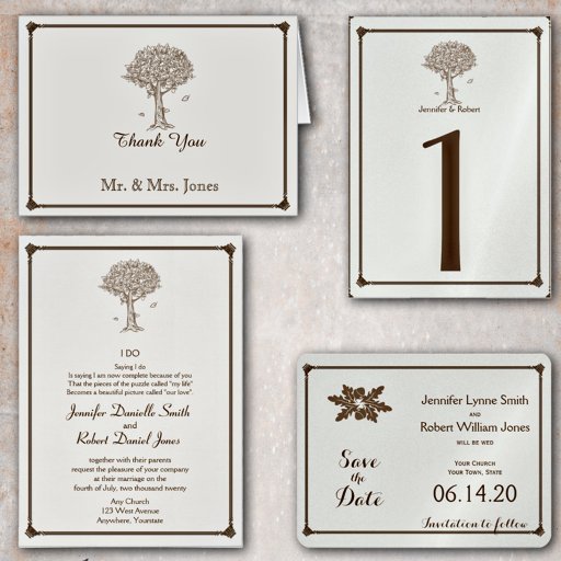 Este bonito design de casamento chama-se Casamento de Desenho de Árvore de Oak. O fundo é uma cor bege esticada e macia, com uma bonito borda dupla e fina, em castanho. No topo há um esboço de um carvalho com algumas folhas caindo em marrom. Algumas peças de sotaque têm bolotas e folhas de carvalho. Perfeito por colocar um simples tema romântico de casamento. Este conjunto tem convites, cartões salve a data, cartões de resposta, cartas de agradecimento, cartões de mesa, rótulos de vinho, e muito mais peças de papelaria de casamento, favores e presentes disponíveis. Todos os elementos são impressos nos nossos produtos de alta qualidade, não incluem ouro real, joias, gravuras ou outros elementos têxteis. Todos os designs são copyright Noteable Express, Inc. Todos os direitos reservados. Envie-me um e-mail em expressões marcáveis em gmail.com para designs, produtos, correspondência de cores ou com solicitações personalizadas.