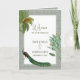 Um design de pássaro de pavão vintage com verde tropical e fundo cor damasco. Este design é ideal para todas as estações. Um elegante design de aquarela num tema contemporâneo. Um design de fã do programa de casamento clássico com penas de pavão gloriosas e elementos modernos. Os convites de casamento e outros artigos de papelaria também estão disponíveis.