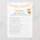 Um jogo divertido para o chá de fraldas é o jogo Quem sabe ser pai? Este jogo apresenta uma faixa amarela no topo e um ursinho de pelúcia com uma abelha de mel. No verso está um ursinho de pelúcia miúda que se inclina sobre um barril de mel observando uma abelha de mel com modelos.