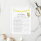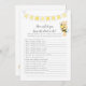 Um jogo divertido para o chá de fraldas é o jogo Quem sabe ser pai? Este jogo tem uma faixa amarela no topo e um ursinho de pelúcia com uma abelha. Ao contrário, um ursinho de pelúcia se debruça sobre um barril de mel observando uma abelha de mel com modelos.