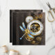 Marcações antigas com engrenagens de ouro e latão, decoradas com libélula mecânica sobre fundo castanho e listrado. Steampunk.