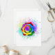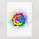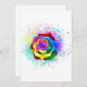 Rosa grande e florescente com pétalas arco-íris sobre fundo branco, pintadas com pedaços de tinta colorida e brilhante. 3d