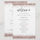 Programa de Casamento Branco de Literatura Dourada do Rosa de Orçamento. Tamanho de 5,5" x 8,5" a um preço orçamentário, em uma elegante estoque LINEN de 110 lb - para um sentimento de luxo pelo valor do excelente, isso é perfeito para programas, convites e menus, etc. Este alternativo de tamanho de orçamento também está disponível em outras opções de papel. O estoque do cartão SEMI-GLOSS de 110 lb tem aproximadamente a mesma espessura do cartão postal, portanto também funciona bem para convites. O papel FELT de 100 lbs é colorido por buff, NÃO branco, então adiciona um toque rústico. O estoque de papel MATTE de 80 lb é branco brilhante, para impressão nítida, excelente para seus menus e programas, enquanto o papel SATIN de 80 lb é fino e leve, ideal para gabinetes. NOTE QUE OS ENVELOPES OPCIONAIS SÃO UM POUCO MAIORES EM TAMANHO A 6,75" x 9" aprox. Este design elegante tem bordas de ouro rosa com brilho inverso em cada lado. Bem-vindo está em um script de estilo manual informal definido e o resto das palavras que você pode personalizar facilmente.