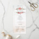 Aglomerados elegantes de rosas rosa pinceladas com aquarela e folhagem verde numa sutil coloração d'água pastel e etiqueta central com bordas douradas. Apresenta um gráfico de texto "Nosso Casamento" na fonte de script personalizada (ou exclui e personaliza no editor de design) com campos de texto editáveis para os detalhes da sua cerimônia e participantes do casamento.