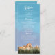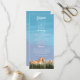 Programa de casamento russo com ilustração de montanhas vermelhas com floresta de pinheiros. Todas as informações da cerimônia de casamento e o nome da festa de casamento listados neste programa. Perfeito para uma queda ou casamento no inverno.