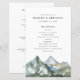 Preencha sua papelaria de casamento 'dia de' com um belo programa de cerimônia, com montanhas de aquarelas e tipografia de cinzas quentes. Personalize o lado inverso para listar os membros da sua festa de casamento.