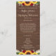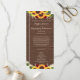Este design de campo rústico apresenta luzes de cordas brancas ouros, rendas vintage, girassóis amarelos, rosas vermelhas de burgundy de marrom e o hálito do bebê branco contra um fundo de madeira marrom-escura. O texto personalizável aparece na frente e no verso em branco-ouro em um roteiro popular e uma tipografia serif no mesmo fundo de madeira marrom-escura. Você pode personalizar este programa para seu próprio casamento mudando o texto na modelo.