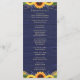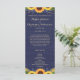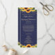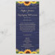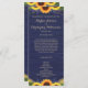 Este design rustico apresenta luzes de cordas de ouro e rendas junto com girassóis e lavandas contra um fundo de madeira azul marinho. O texto, com nomes personalizáveis de noiva e noivos e detalhes de eventos, aparece em ouro pálido na escrita popular e na tipografia serif. Você pode personalizar este programa para seu próprio casamento mudando o texto na modelo.