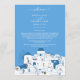 Um belo desenho do cartão Itinerário com ilustração rústica de Santorini, igrejas de cúpula azul, Bougainvillea, plantas de vaso aterrorizado com um fundo de lavagem branca na ilha grega. Um elegante destino Santorini, o desenho do casamento grego perfeito para casamentos do estilo Santorini e da ilha grega do Mediterrâneo. O reverso do cartão mostra um monograma minimalista com uma igreja de cúpula azul. Os convites de casamento e outros artigos de papelaria também estão disponíveis.