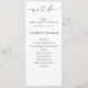 Um moderno programa de casamento preto e branco com caligrafia elegante e um layout minimalista. Essa design elegante e sofisticada traça a ordem da cerimônia, garantindo que os hóspedes possam acompanhar com facilidade. Perfeito para casamentos contemporâneos, formais ou rústicos, este programa adiciona um toque na moda a qualquer cerimônia.