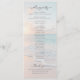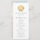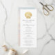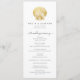 Elegante programa de casamento sobre o tema da concha de ouro moderna em um tamanho muito fino com uma foto de um fundo azul-turquesa de praia oceânica que pode ser substituído por sua própria foto de férias de noivado ou praia para personalizar o divertido design do programa tropical. Sofisticado e minimalista para um casamento costeiro chic.