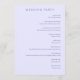 This elegant wedding program features a serene lavender background with a simple, sophisticated layout. The design includes a watercolor illustration of lavender flowers in the lower left corner, adding a touch of natural beauty and softness. The text is arranged in a clear, organized manner using a classic serif font, creating a harmonious contrast against the light backdrop. Perfect for a formal wedding ceremony, this program exudes a tranquil and romantic atmosphere, making it an ideal choice for couples seeking a refined and gentle aesthetic.