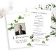 Lembre-se do seu amado e comemore sua vida com o bonito Programa Funeral Ivy Vine, do inglês Verde. Esta elegante linha do tempo do serviço de memorial verde personalizado apresenta uma fotografia botânica pintada por uma coloração aquosa digital de folhas verdes de folhagem de marijuana com fundo branco. Personalize-o com uma fotografia do falecido, dos seus dados pessoais e da ordem da cerimônia de celebração do serviço da igreja.