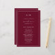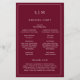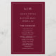 Programa de Casamento Simples com um design moderno, mas elegante, com seu monograma de duas letras no topo e seus detalhes cercados por uma fina fronteira. Todo texto está em branco sobre um fundo burgundy e pode ser alterado na ferramenta de edição de design. A frente tem sua ordem de cerimônia e a parte de trás tem sua festa de casamento e obrigado. Um design chic e na moda que é excelente para um casal minimalista. Estes programas de casamento baratos são impressos em folhas de papel para uma opção econômica.