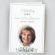 Um belo e elegante programa funerário dobrado adorado com simples folhas verdes de eucalipto elegantes. A frente apresenta uma foto de retrato em forma oval, enquanto a dentro inclui espaço para o obituário, a ordem de serviço e uma foto da família. A parte traseira oferece uma seção personalizável para um poema, oração ou reconhecimento. Perfeito para um funeral, memorial ou celebração da vida, esta design oferece uma maneira sincera de honrar o seu amado.