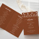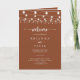 Esta corda ilumina o programa de casamento dobrado de terracotta é perfeito para um casamento clássico. A design apresenta belas luzes de cordas pintadas manualmente em um fundo de terracota. Inclua uma citação ou mensagem curta, ordem de serviço, festa de casamento e obrigado da mensagem.