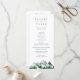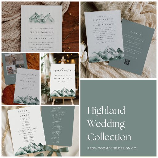 Parte da coleção Highland da Redwood & Vine Design Co., esta carta do programa de casamento de dupla face apresenta uma tipografia elegante e uma ilustração serena de serena aquarela em tons verdes e ardentes suaves. A parte frontal mostra o cronograma da sua cerimônia, enquanto a outra apresenta sua festa de casamento com formatação limpa e fácil de ler. Um belo jogo para casamentos no inverno rústicos, ao ar livre, montanhosos, especialmente aqueles com decoração natural, florestal ou de inspiração alpina.