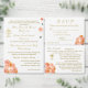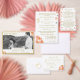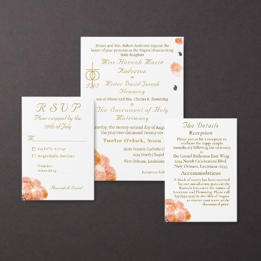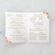 O cobrir design apresenta o símbolo tradicional de cruz e anéis para o casamento no canto superior esquerdo. O cabeçalho personalizável é exibido em uma fonte Nupcial elegante que exibe nomes de noiva e noivo. A data e o nome da igreja são também apresentados abaixo. Lindas imagens de pêssego e rosas de cor terracota agravam os cantos. Dentro apresenta o formato tradicional de um casamento católico. Cobrir traseiro exibe a foto que você fornece junto com a mensagem de gratidão. Todo texto é personalizável. Possui espaço para até sete damas e padrinhos de casamento. Projetado para coordenar com a "Suíte de Casamento Católico de Terracotta".