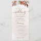 Cartões do programa de casamento estilo moderno da boêmia, com flores a cores aquáticas e folhas de outono em tons sujos, como marrom-ferrugem, laranja queimado e terracota. Escolha perfeita para casamentos no outono.
