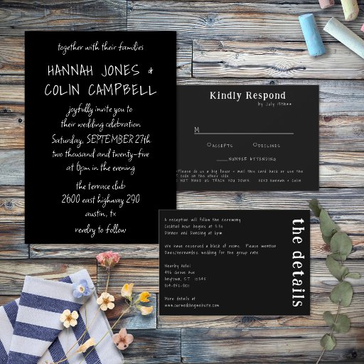 Elementos: tipografia escrita à mão, fontes brancas. Cores: texto branco sobre fundo preto. Temas: casual, foto, ao ar livre, romântico, cervejaria, capricho, casamento no quintal, casamento frio. Coleção: Tipografia Manuscrita Casual Tipo de Produto da Coleção de Casamentos Brancos e Pretos: Programa