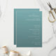 This elegant wedding program features a minimalist design with a calming teal background and crisp white text. The layout is clean and organized, showcasing the ceremony schedule in a simple sans-serif font that ensures readability. A mix of cursive and bold uppercase fonts highlights key elements like "welcome" and the names, adding a personal touch. Perfect for couples seeking a modern and understated aesthetic, this program conveys sophistication while keeping the focus on the special day's details.