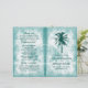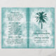 Estes programas dobrados são perfeitos para qualquer casal planejando uma celebração romântica de casamento na praia. A design apresenta uma palmeira verde-tropical sobre um fundo de turquesa e de efeito branco com uma redação editável coordenada por cor. O design simples pode ser personalizado para se adequar ao seu evento especial e será a ordem de serviço perfeita para qualquer festa temática tropical, incluindo chás de panela, noivados, chás de casamento, festas de aniversário e muito, muito mais.