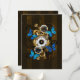 Composição do relógio de aço redondo com discagem numérica romana preta, decorado com engrenagens de ouro e latão, borboletas morfo azuis e lentes danificadas sobre fundo listrado castanho. Estilo Steampunk.
