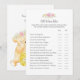 Um jogo divertido para o chá de fraldas é o jogo dos contos das velhas esposas. Este cartão de jogo apresenta florais cor-de-rosa no topo. No verso está um ursinho de pelúcia miúda que se inclina sobre um barril de mel observando uma abelha de mel com modelos.