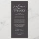 Make a heartfelt first impression at your wedding reception with this sophisticated "Welcome & Thanks" place card—designed to rest beautifully on each guest’s plate, in charcoal grey theme. Featuring graceful script typography and a timeless layout, this elegant card warmly greets your loved ones while expressing gratitude for sharing your special day. Ideal as a dual-purpose place card & welcome note—combine sentiment and function without cluttering your tables-cape. Designed for couples who value refined details, this card complements modern and luxe wedding themes. Print on premium card stock for a luxurious finish that guests will cherish (or even keep as a sweet keepsake!). Because love is best served with gratitude.