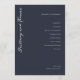 This wedding program features a sophisticated, modern design with a navy blue background and elegant white script typography. The layout is clean and organized, showcasing the ceremony details in a structured format that includes sections for procession, vows, unity ceremony, and recessional. The minimalist aesthetic creates an inviting and formal atmosphere, perfect for couples seeking a timeless and classic look for their special day.