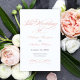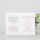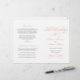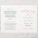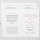 A caligrafia rosa delicado romântico escreve "O Casamento De" em letra ornamentada e fluída através deste elegante programa de cerimônia. Delicados floreios em moldura cor-de-rosa combinando enquadram o design em um fundo branco para um visual suave e feminino. As páginas internas são totalmente personalizáveis para sua festa de casamento, ordem da cerimônia e uma mensagem pessoal de agradecimento na capa traseira. Os programas são impressos em papel de peso de texto e chegam planos, exigindo uma simples dobra no centro.