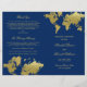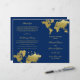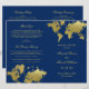 Um mapa-múndi luxuoso no estilo folha de ouro brilha contra um rico fundo azul-marinho neste impressionante programa de cerimônia para casais que amam viajar e casamentos em destinos paradisíacos. "Cerimônia de Casamento Unindo" apresenta seus nomes em letra cursiva elegante sob o mapa dourado, com acentos de salpicos dourados que adicionam profundidade artística. As páginas internas são totalmente personalizáveis para sua comitiva de noivos, ordem da cerimônia e uma mensagem pessoal de agradecimento na contracapa. Os programas são impressos em papel de peso de texto e chegam planos, exigindo uma simples dobra central.