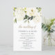 Design apresenta ídrangas elegantes e elementos de aquarela rosa em tons de branco, ouro, marfim e outras cores neutras sobre verde, eucalipto e outras folhagem botânica. Este modelo também apresenta um layout tipográfico moderno que consiste em fontes cursivas e sans serif em preto claro e dourado.