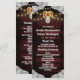 Programas de Casamento em Pote de Pedra com Girassóis - apresentam um fundo de madeira de celeiro vermelho escuro aparado com renda e decorado com luzes cintilantes de corda de cor quente. O design também apresenta um buquê de girassóis dentro de um pote de pedra que você pode personalizar as iniciais para as de sua escolha.