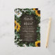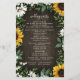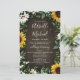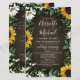 Design apresenta um fundo de madeira marrom decorado com margaridas, girassóis, verde, eucalipto, hálito de bebê e lírio do vale.