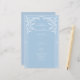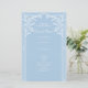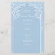 Este cartão de casamento exude elegância e sofisticação. O fundo azul macio fornece uma canvas serena fresca que complementa perfeitamente os intrincados padrões florais brancos ao redor das bordas. O cartão de programa é escrito em caracteres modernos e ousados, enfatizando a importância do evento. O resto do texto está numa escrita clássica, graciosa, criando um contraste harmonioso. No geral, esta design combina lindamente a tipografia moderna com elegância eterno, fazer ideal para qualquer celebração romântica de casamento. F004