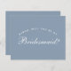 Uma proposta simples e minimalista de madrinha que também comunica a cor do casamento para os vestidos de madrinha. É apenas um texto branco sobre fundo azul empoeirado (uma cor moderna, popular para vestidos de madrinha). A palavra Bridesmaid na frente e a mensagem no verso são escritas em um roteiro caligráfico elegante, o texto arquivado "[Name] you be my" acima da palavra Bridesmaid em bonés pequenos.