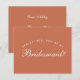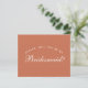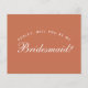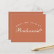 É apenas texto branco em um fundo de terracota (marrom), uma cor moderna. A palavra Dama de Honra na frente e a mensagem no verso são escritas em uma fonte caligráfica elegante, o texto arqueado "[Nome] você será minha" acima da palavra Dama de Honra em letras maiúsculas pequenas.