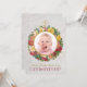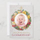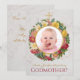 Proposta de madrinha para o batismo de uma menina. Tem uma foto de uma menina bebê em placeholder em uma coroa de rosas silvestres com uma cruz dourada no topo.