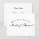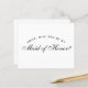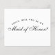 Uma proposta simples e minimalista de dama de honra: apenas texto preto em fundo branco. As palavras Dama de Honra na frente e a mensagem no verso são escritas em uma elegante caligrafia, o texto arqueado "[Nome] você quer ser minha" em letras maiúsculas pequenas.