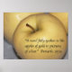 A poster da Escritura apresenta este verso do texto do Rei James: "Uma palavra falada corretamente é como maçãs de ouro em fotos de prata." Proverbs 15:11 Foto mostra fechamento de uma maçã deliciosa ouro. O enquadramento está disponível.