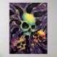 Uma peça psicodélica com crânios formados em várias plumas de fumaça. Os crânios e a fumaça são misturados em diferentes tons de roxo, azul, verde, laranja e amarelo. A disposição e as cores deste Trabalho de arte lembram muito os antigos Posters de luz negra dos anos 70 e 80. Trabalho de arte por Cores Profundas de Gregg.