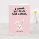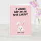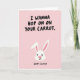 Este cartão apresenta um fundo rosa-claro com bordas suavemente ásperas ao longo da parte superior e inferior, como papel texturizado. No centro, há uma simples cabeça de coelho branca 🐰 com orelhas longas e eretas sombreada de rosa por dentro, um narizinho rosa-brilhante e olhos pequenos e escuros que lhe dão um visual doce e convidativo. A expressão suave do coelho e a pose voltada para a frente adicionam um tom galante e amigável, como se estivesse se inclinando para um elogio zombeteiro. Na metade superior, letras maiúsculas pretas e grandes dizem “I WANNA HOP ON ON YOUR CARROT” (Quero pular no seu cenoura), em um estilo casual e desenhado à mão que parece um pouco atrevido contra as cores suaves. Perto da parte inferior, “HAPPY EASTER” (Feliz Páscoa) aparece na mesma letra preta, menor e centralizada para equilibrar o layout. A paleta limitada - rosa