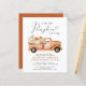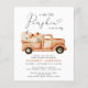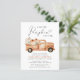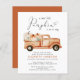 Um convite à chá de fraldas, amigável do ponto de vista do gênero, que apresenta "um doce pequeno abóbora está a caminho" numa mistura de tipografia moderna e um roteiro de na moda com um inchaço cardíaco, e aquarelas de um caminhão de coleta laranja vintage cheio de abóboras e buquês florais. Personalize o nome da mãe em uma tipografia simples do terracotta. Especificar o sexo do bebê, se desejado (por exemplo, "está a caminho").